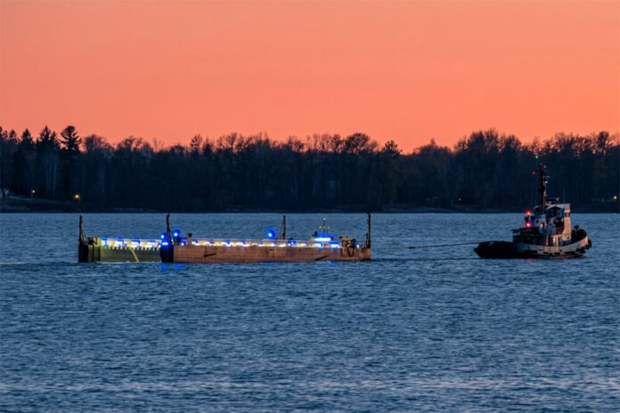 Aufbruch in die Freiheit: Die Schute mit dem Buckelwal verlässt die Wismarer Bucht (Symbolbild: KI-generiert/SN-AKTUELL)