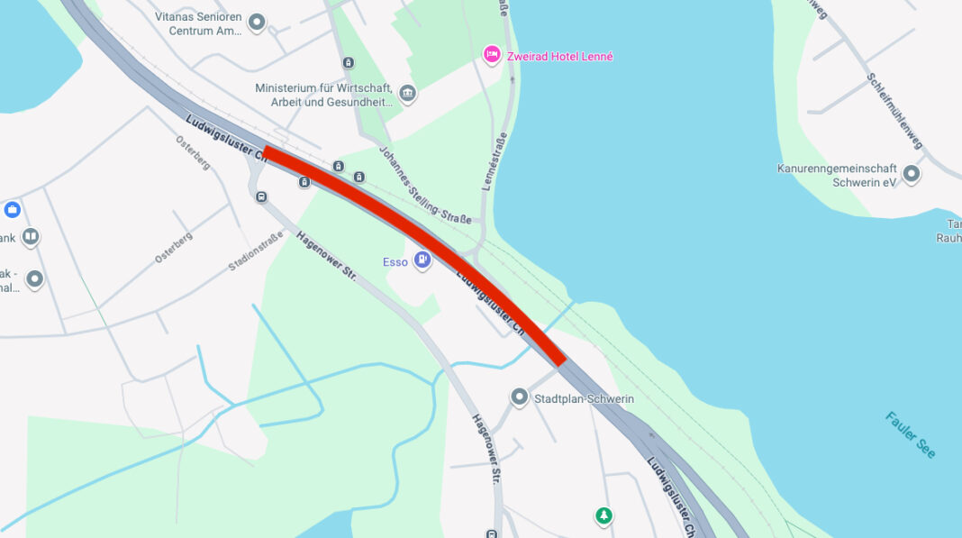 Diese beginnen in Höhe Kreuzung Hagenower Straße und enden auf Höhe der Auffahrt Lennéstraße. Ebenfalls von der Instandsetzungsmaßnahme betroffen ist die Straße „Am Püsser Krug“. Für die Anwohner stehen während der Bauzeit Ausweichparkplätze am Ende des Baufeldes zur Verfügung. Die Baumaßnahme erfolgt wechselseitig stadtein- und auswärts mit Verschwenk der Fahrspuren. Der Busverkehr des Schweriner Nahverkehrs wird während der Maßnahme aufrechterhalten. Hierzu werden Ersatzhaltestellen eingerichtet.
