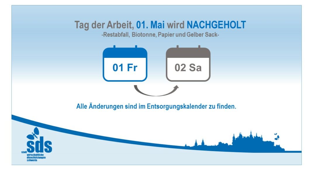 Schwerin – An gesetzlichen Feiertagen erfolgt keine Abfuhr von Hausmüll, Bioabfall und Wertstoffen. Die Abfuhrtermine für Freitag, den 1. Mai, werden am darauffolgenden Tag, Samstag, den 2. Mai, nachgeholt. Der Eigenbetrieb SDS – Stadtwirtschaftliche Dienstleistungen bittet darum, die Änderungen der Entsorgungstage zu beachten. Die geänderten Termine sind auch im Ratgeber für ein sauberes Schwerin, im Entsorgungskalender auf www.sds-schwerin.de oder in der Abfallkalender-App zu finden.