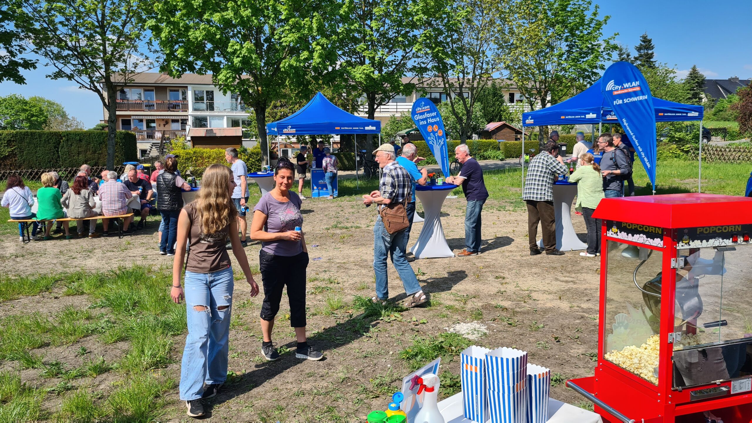 Doch auch im Vorfeld eines Bauprojekts spielen die regionale Verankerung und Kundenbedürfnisse eine wichtige Rolle: „Uns ist es wichtig, die Fragen unserer Kundinnen und Kunden in einem persönlichen Gespräch vor Ort zu klären“, erläutert Thomas Pfau, Leiter Planung und Bau Breitbandnetze bei den Schweriner Stadtwerken. „Wir haben langjährige Erfahrung bei Planung, Bau, Betrieb und Instandhaltung von Versorgungsnetzen, aber für die jeweiligen Haushalte ist es immer etwas Besonderes, wenn vor der eigenen Haustür neue Leitungen verlegt werden. Für einen lockeren Austausch zu diesen Themen bieten sich unsere Glasfaser-Feste direkt vor Ort an – wie kürzlich im Baumviertel. Da kamen wir mit knapp 70 Anwohnerinnen und Anwohner zu ihrem persönlichen Glasfaser-Anschluss ins Gespräch.“