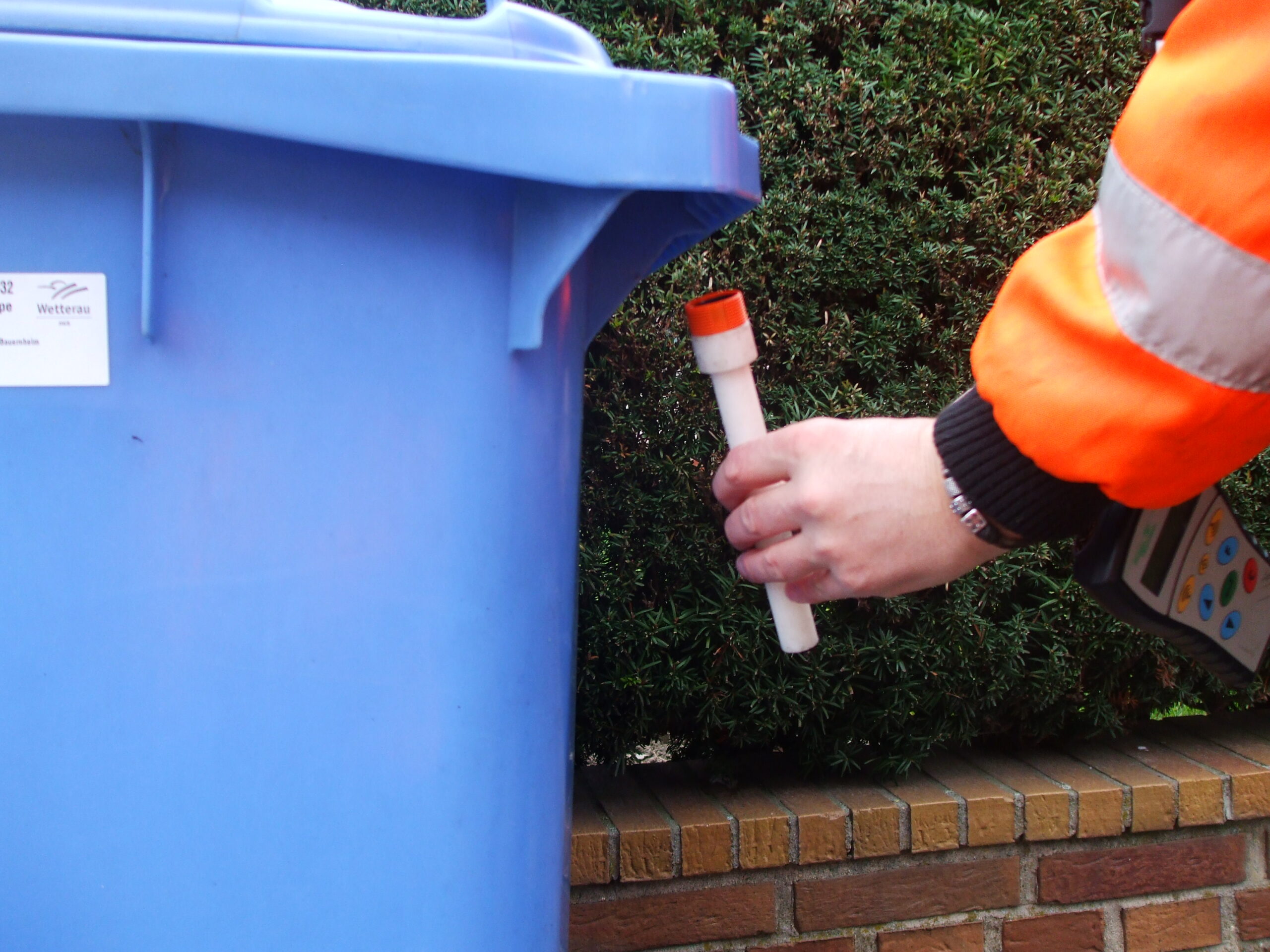 Ein beauftragtes Montageteam bringt Ende Februar/Anfang März seitlich ein Behälteretikett an und montiert den Transponder an der Griffleiste. Die Nachrüstung aller Tonnen der Stadt dauert insgesamt etwa vier Wochen.