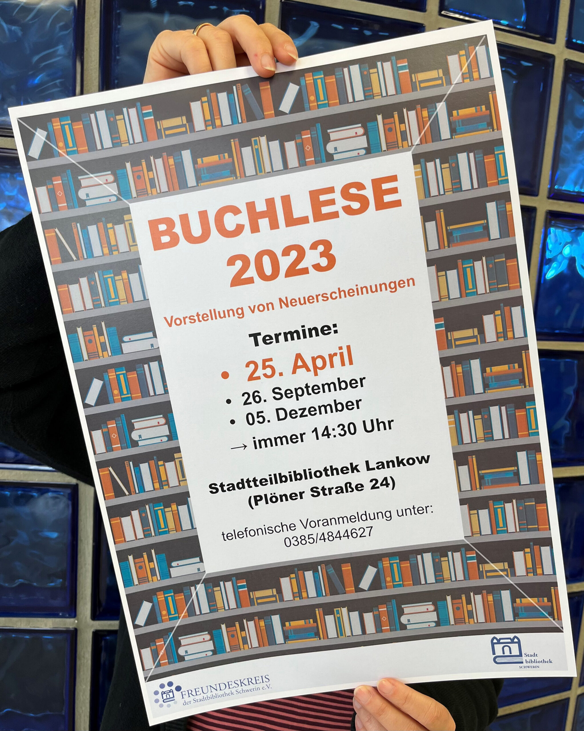 Schwerin – Es ist wieder soweit: Bibliothekarinnen der Schweriner Stadtbibliothek stellen am 25. April, um 14.30 Uhr im Rahmen der Veranstaltungsreihe „Buchlese“ neu erschienene Bücher, Hörbücher und Kinderbücher fernab der Bestsellerlisten in der Stadtteilbibliothek in Lankow vor. In den letzten Wochen haben die beiden Bibliothekarinnen unermüdlich den Fundus an Neuheiten in der Stadtbibliothek sondiert, kritisch geprüft und neugierig gelesen, um die Spreu vom Weizen zu trennen und ihre Lieblingsbücher empfehlen zu können. Unterstützt werden sie dieses Mal von Kulturdezernent Silvio Horn, der an diesem Nachmittag sein Lieblingsbuch der neu erschienenen Werke vorstellen wird.
