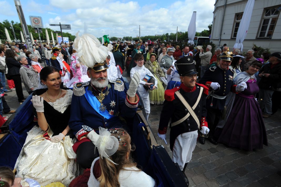 Am Sonnabend kehrt Großherzog Friedrich Franz II. nach historischem Vorbild in sein Schloss zurück. Ganz so wie 1857, als er es nach aufwändigen Umbauarbeiten mit großem Pomp neu einweihte. Gemeinsam mit der Großherzogin samt Gefolge wird er morgens um 10 Uhr im Fürstenzimmer am Hauptbahnhof empfangen, um anschließend mit musikalischer Begleitung durch die Straßen bis zum Schloss zu fahren, dessen Hausherr er vor mehr als 160 Jahren wurde. Die Straßen sind gesäumt von Schaulustigen, die dem farbenfrohen Tross aus höfischen Bediensteten, Bürgern im Sonntagsstaat und, in der prächtigen Kutsche sitzend, dem Großherzog und seiner Gattin zujubeln.