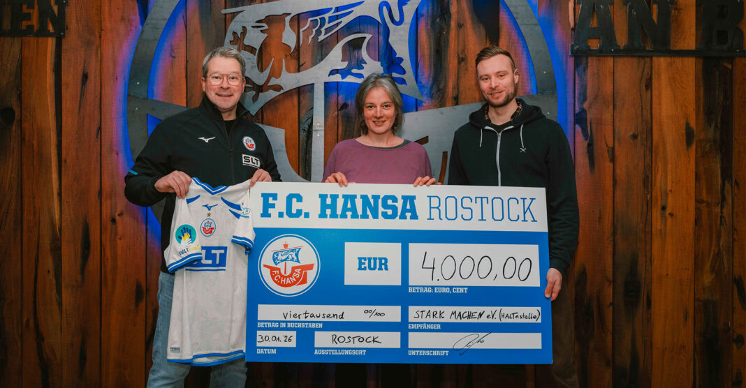 Rostock – Der F.C. Hansa Rostock hat 4.000 Euro an den Verein Stark Machen e. V. übergeben, um das Präventionsprojekt „HALTestelle“ zu unterstützen. Der Vorstandsvorsitzender Ronald Maul übergab den Scheck persönlich an die Projektmitarbeiter Sabine Janzon und Robin Sebastian, die stellvertretend für das Projekt die Spende entgegennahmen.