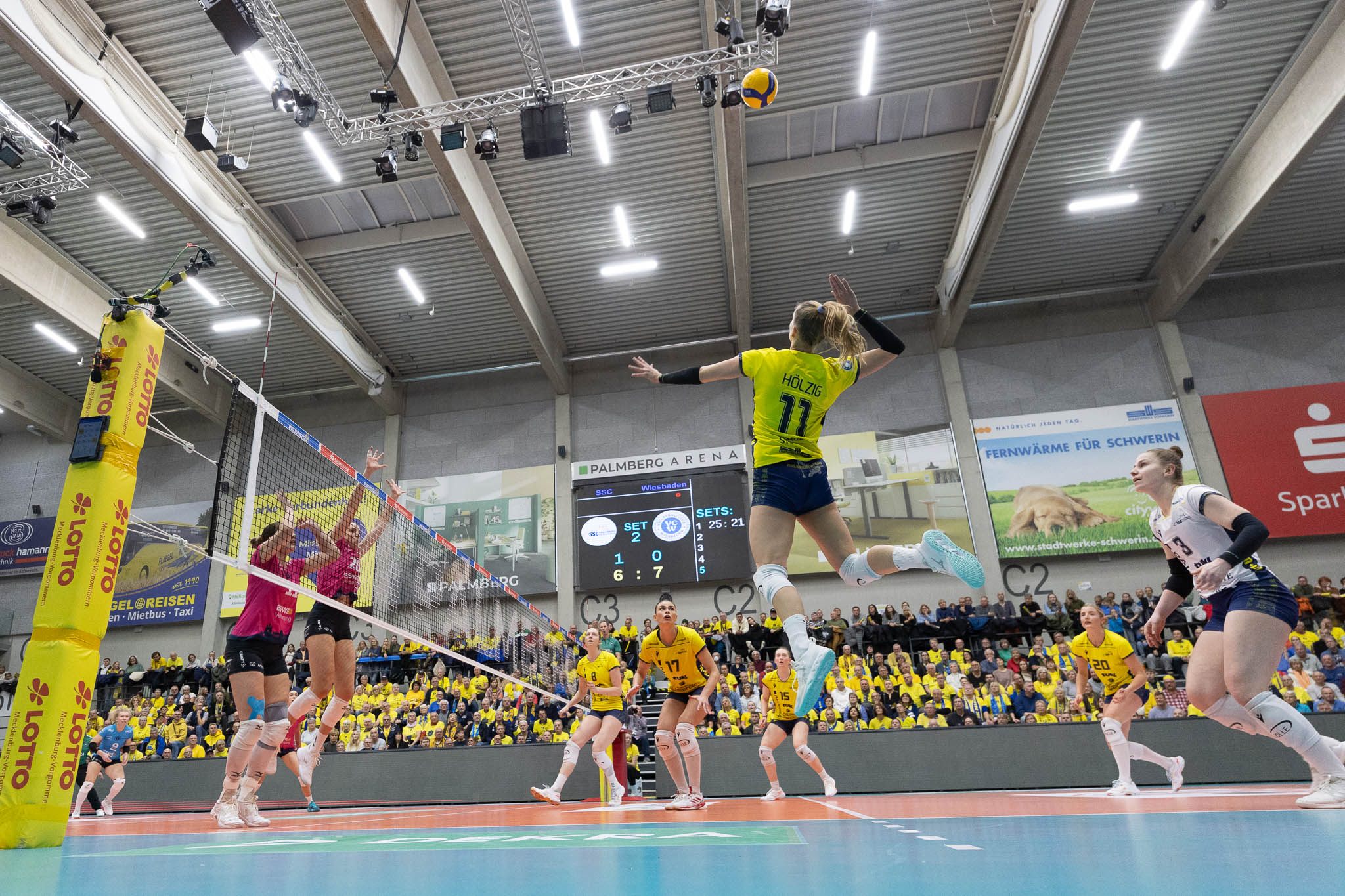 Die vorweihnachtliche Partie zwischen dem SSC Palmberg Schwerin und dem VC Wiesbaden begann im ersten Satz ausgeglichen. Beide Teams leisteten sich zu Beginn einige Aufschlagfehler, sodass sich zunächst keine Mannschaft entscheidend absetzen konnte. In dieser Phase hielten vor allem Mia Kirchhoff und Kapitänin Anne Hölzig den Schweriner Angriff am Laufen und erwiesen sich als verlässliche Punktelieferantinnen. Den ersten klaren Vorsprung erspielte sich der SSC durch eine starke Aufschlagserie von Jet Kok, ehe zwei Asse von Britte Stuut den Abstand auf 17:13 ausbauten. Schwerin gewann nun zunehmend die Kontrolle über den Satz. Auch Anne Hölzig setzte mit zwei Assen von der Grundlinie wichtige Akzente und zwang Wiesbaden beim Stand von 21:15 zur Auszeit. Für einen kurzen Schreckmoment sorgte anschließend eine Verletzung der Wiesbadener Libera Rene Sain, die nach einer Kollision mit der LED-Bande am Knie behandelt werden musste. Die Gäste reagierten mit personellen Umstellungen: Bitau kam für Clayton zur Stabilisierung der Annahme, im Angriff brachte Wiesbaden van der Pijl, die zwar punktete, den Lauf der Schwerinerinnen jedoch nicht mehr stoppen konnte. Mit insgesamt sieben erspielten Satzbällen steuerte der SSC sicher auf den Satzgewinn zu. Den Schlusspunkt setzte schließlich Jet Kok, die im fünften Anlauf den entscheidenden Angriff verwandelte und Schwerin den ersten Durchgang mit 25:21 sicherte.